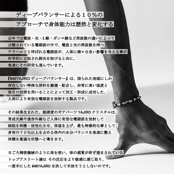 846YAJIROディープバランサーは限られた地域にしか存在しない特殊な原料を厳選・配合し、非常に高い温度と独自の開発技術を用いることによって加工形成に成功した、人体により有効な電磁波を放射する製品です。その結果生まれた、超高度ギアパーツ【YAJIROクリスタル】は育成光線や遠赤外線など人体に有効な電磁波を放射し細胞を刺激・活性化させ身体の約70%〜80%を占める体内の水分にアプローチし